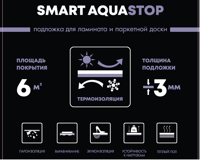 Материал – XPS Площадь покрытия 5,5 м2 Термическое сопротивление 0,18 м2К/Вт IS (шумоизоляция) – снижение ударного шума до 20 Дб RWS (шумопоглощение) – снижает шум в помещении при ходьбе Динамическая нагрузка до 250 000 циклов Выравнивание точечных неровностей до 2,6 мм